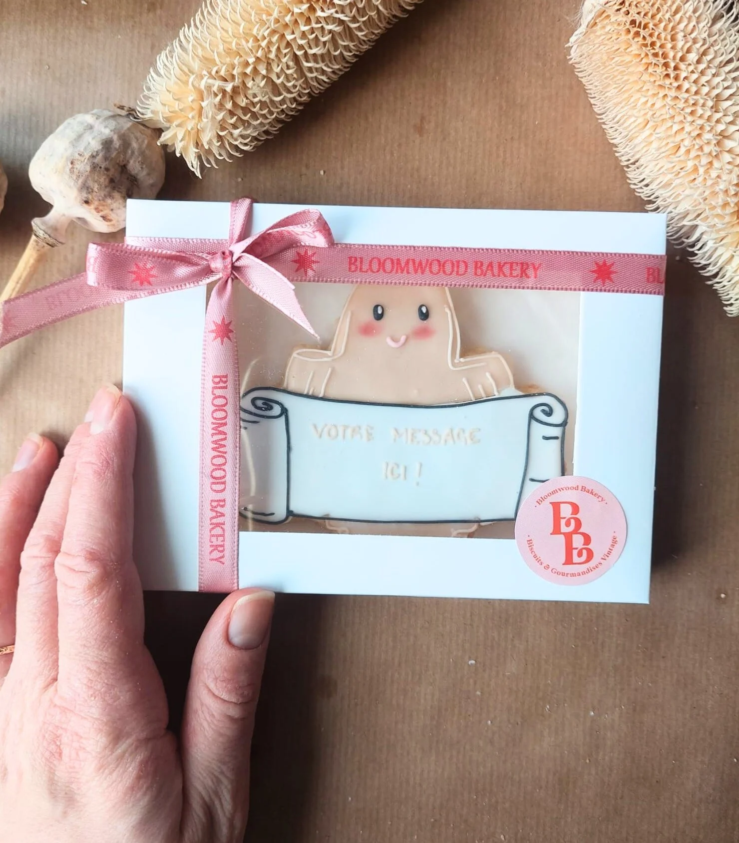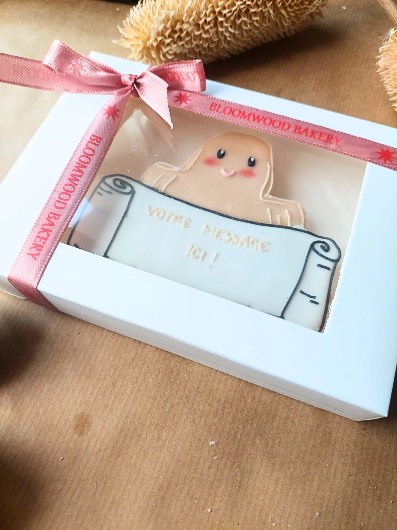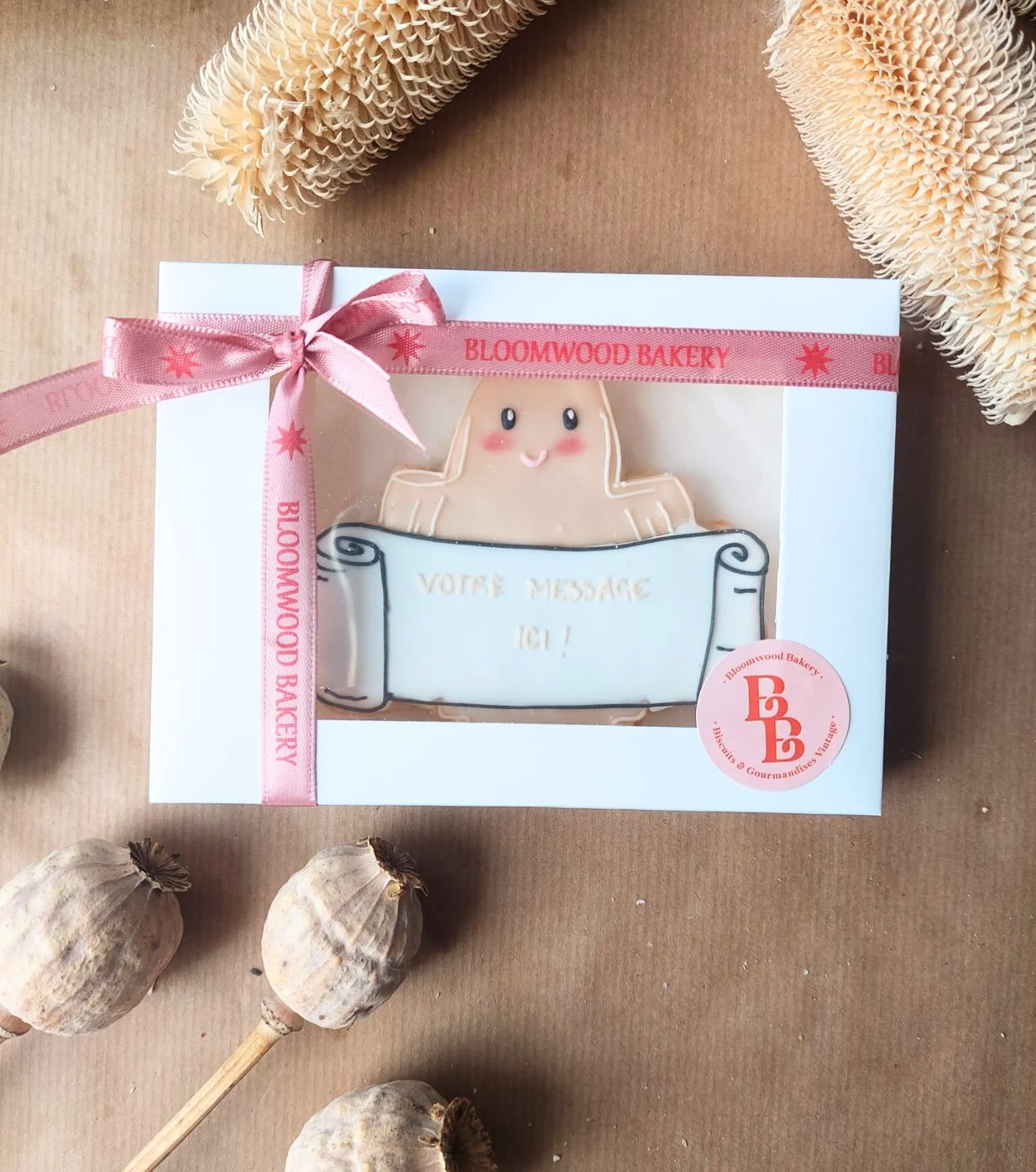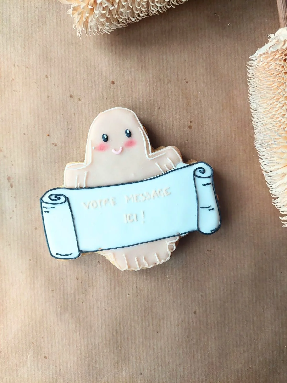 Craquez pour notre coffret de biscuits décorés à la main, mettant en scène un adorable petit fantôme tenant une bannière personnalisable avec le message de votre choix. Un plaisir aussi mignon que délicieux, parfait pour ajouter une touche fun à vos fêtes ou surprises gourmandes !